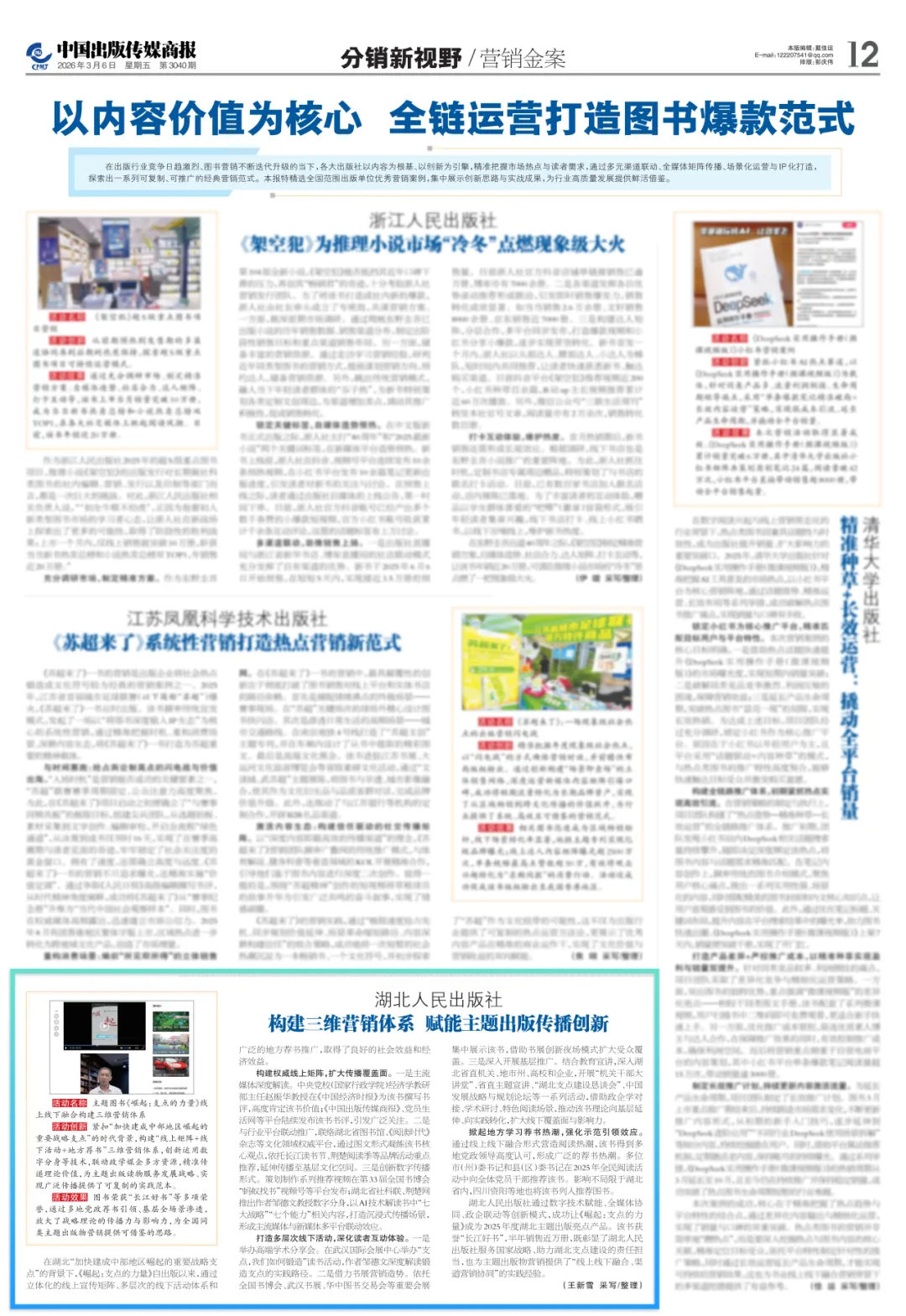 在出版行业竞争日趋激烈、图书营销不断迭代升级的当下,各大出版社以内容为根基、以创新为引擎,精准把握市场热点与读者需求,通过多元渠道联动、全媒体矩阵传播、场景化运营与IP化打造,探索出一系列可复制、可推广的经典营销范式。近日,《中国出版传媒商报》刊发专题报道《以内容价值为核心 全链运营打造图书爆款范式》,精选全国范围出版单位优秀营销案例,集中展示创新思路与实战成果,为行业高质量发展提供鲜活借鉴。我社“主题图书《崛起:支点的力量》线上线下融合构建三维营销体系”入选“优秀营销案例”。