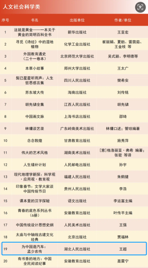 本次评选秉承邹韬奋先生“竭诚为读者服务”的出版精神,严格遵循专业标准,采取“专家指导、大众做主”推荐机制,对参评图书进行多方面综合评估,《为中国造汽车:孟少农传》为全国100种获选“韬奋好书”的图书之一。