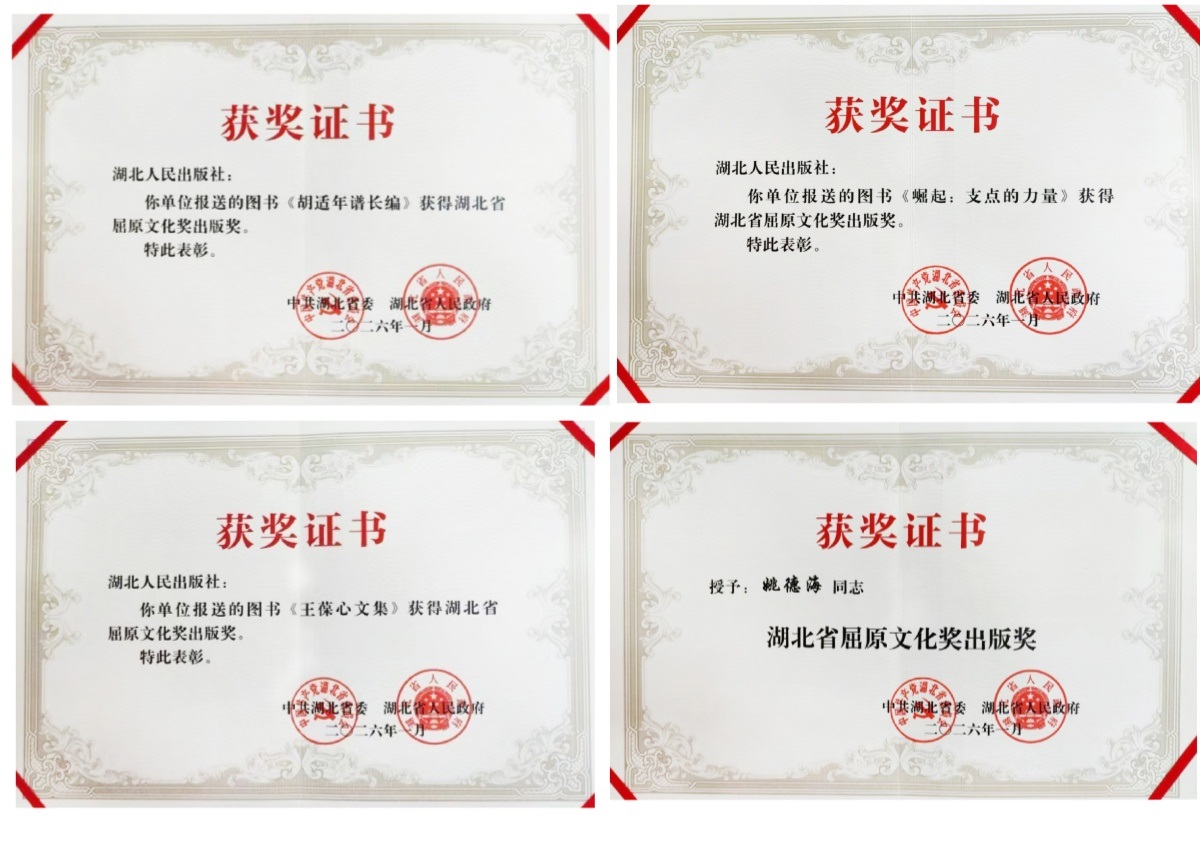 湖北人民出版社凭借深厚的文化积淀、坚定的精品追求与卓越的人才培育,在本次评选中大放异彩,一举斩获五项殊荣:《胡适年谱长编》《崛起:支点的力量》《王葆心文集》三部图书荣获出版奖,《沈虹光文集·散文随笔卷》摘得文学奖,社党委书记、总经理姚德海荣获出版个人奖。